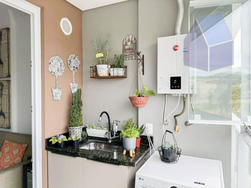 Sacada na sala de estar, com máquina de lavar e secar;
