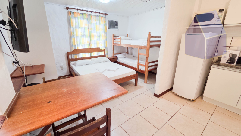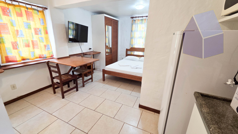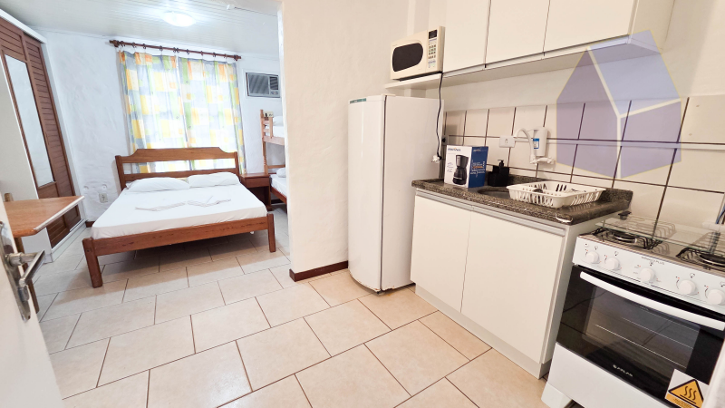 Dormitório, sala de Jantar e cozinha em ambientes integrados;